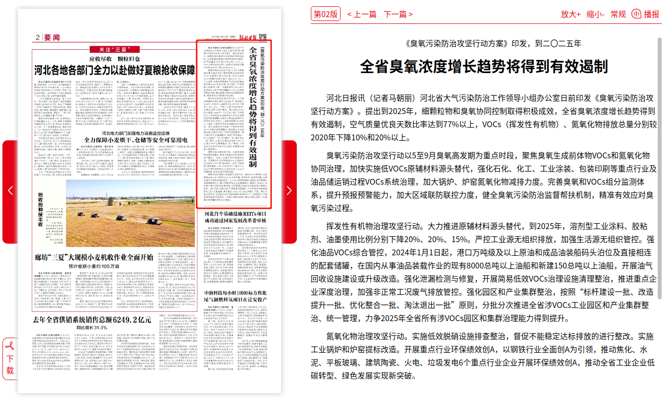 臭氧污染防治攻堅行動以5至9月臭氧高發(fā)期為重點時段,聚焦臭氧生成前體物VOCs和氮氧化物協(xié)同治理,加快實施低VOCs原輔材料源頭替代,強化石化、化工、工業(yè)涂裝、包裝印刷等重點行業(yè)及油品儲運銷過程VOCs系統(tǒng)治理,加大鍋爐、爐窯氮氧化物減排力度。完善臭氧和VOCs組分監(jiān)測體系,提升預(yù)報預(yù)警能力,加大區(qū)域聯(lián)防聯(lián)控力度,健全臭氧污染防治監(jiān)督幫扶機制,精準有效應(yīng)對臭氧污染過程。