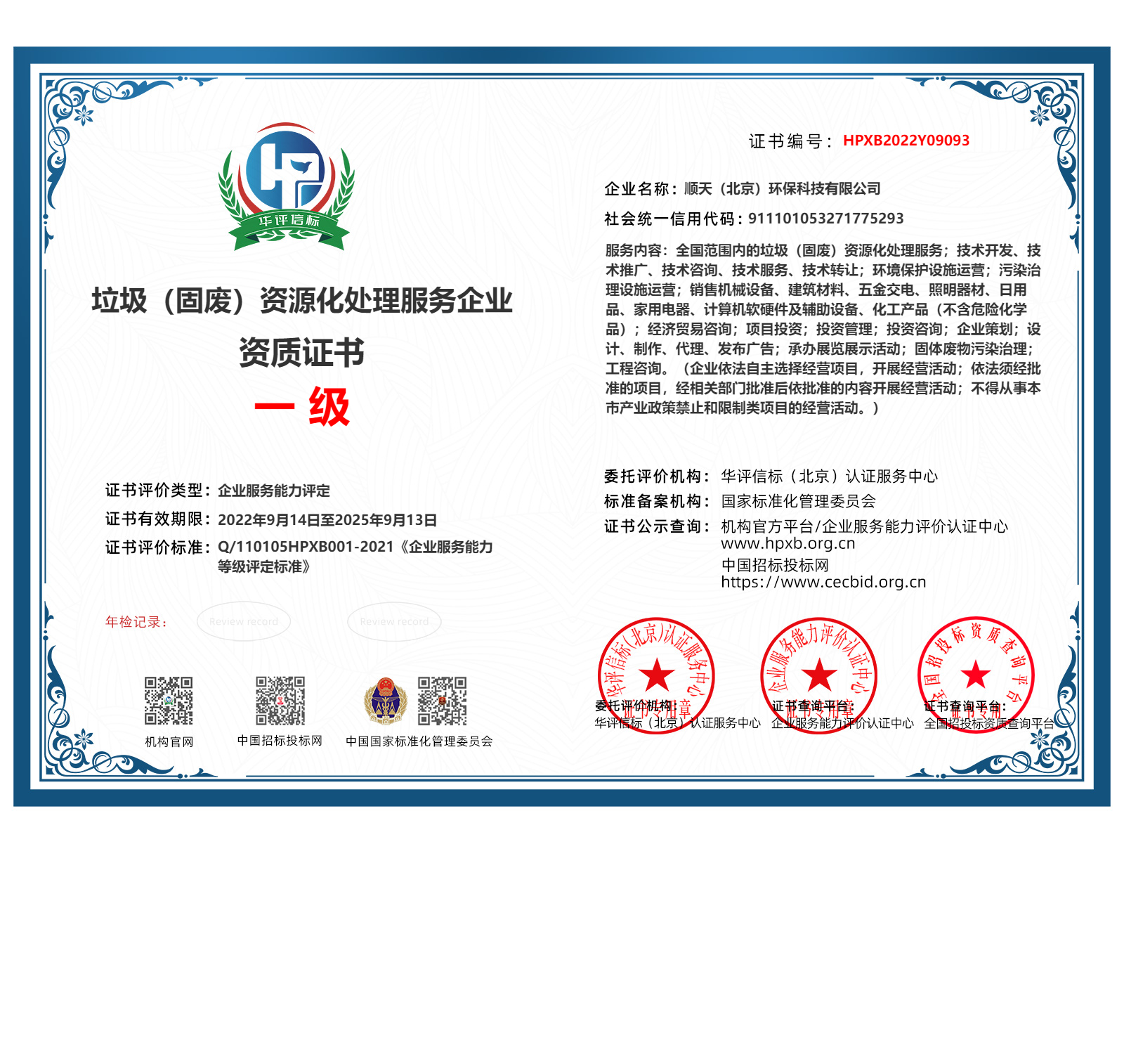 垃圾分類宣傳培訓(xùn)服務(wù)企業(yè)一級資質(zhì)證書