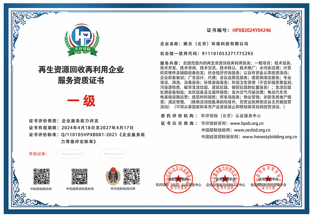 再生資源回收再利用企業(yè)服務(wù)一級資質(zhì)證書